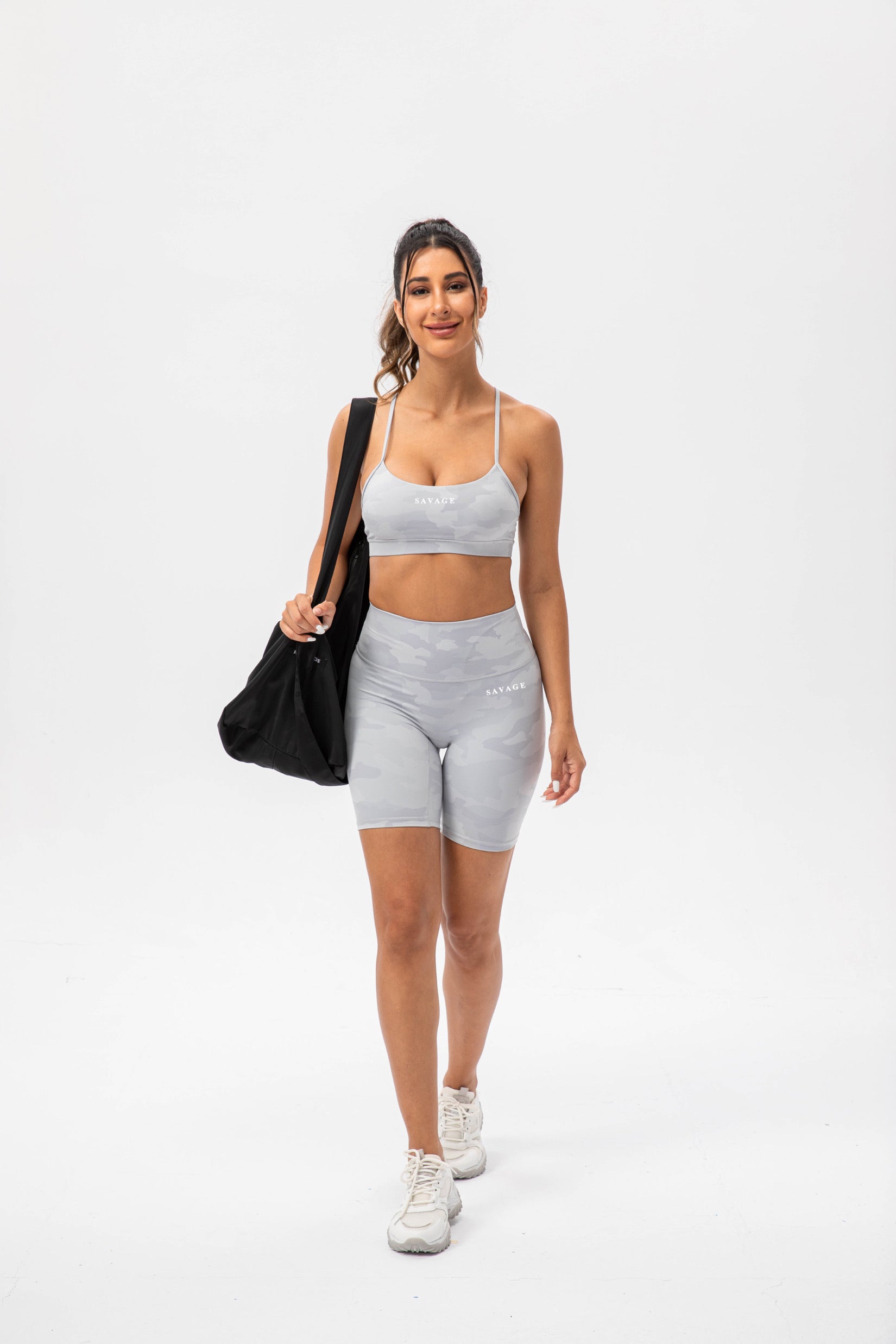 90% nylon 10% spandex. Light gray Camo. Breathable & flexible gym wear!
